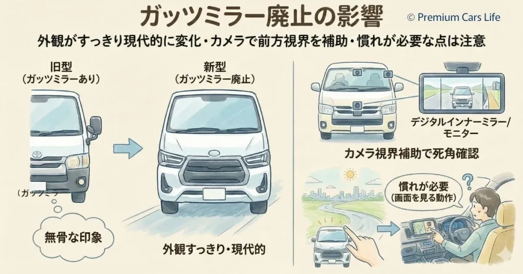 また、長年ハイエースの象徴だったガッツミラーが廃止され、カメラとモニターによる視界確保へと変更されています。